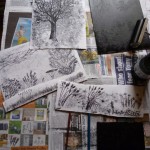 Today was yet another grey day, but a free day to create, so I took the opportunity to stay indoors and focus on something I am rarely able to do… spreading my materials out all over the table and taking my time to create. I inked up the lino, tore up some large sheets of paper to fit the tiles and started to draw what I saw from the window… not the garden as a whole, but the individual elements that make up my pretty, small, but unkempt garden… the big tree whose leaves have appeared only this month; the blueberry bush whose flowers are fading, promising fruit; the white-flowering shrub whose name I have never known; the tall grasses at the back, waving, drooping in the breeze; some smaller flowers, low to the ground; the old metal table; the honeysuckle, not yet flowering; the winding wisteria. Of course, being mono-printing, when the paper was turned, the drawings were in reverse, but I was happy with the overall effect. When the ink had dried, I tore around each element then stuck them back down on another piece of paper to make the finished piece.